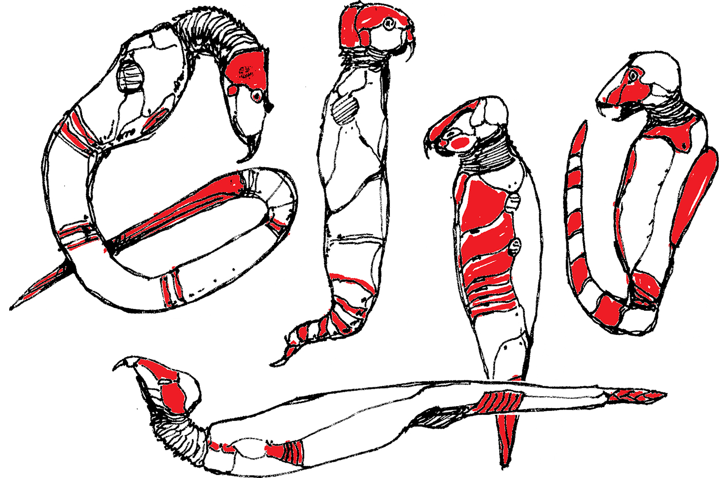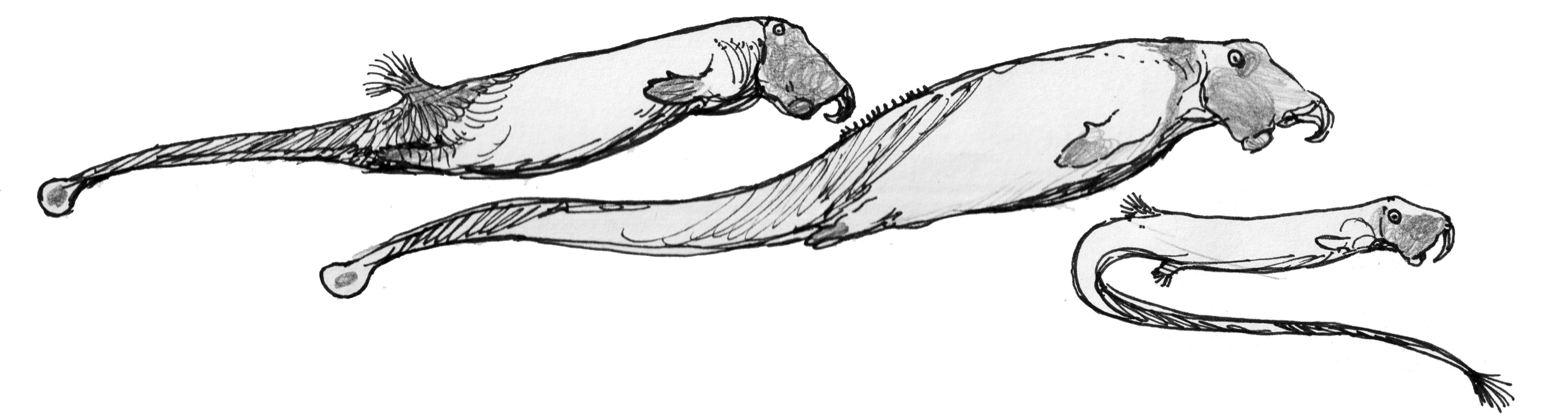 Sketches of reptilian animals with extended lower-jaw projections. Not actual animals, but the results of an exercise in speculative evolution.