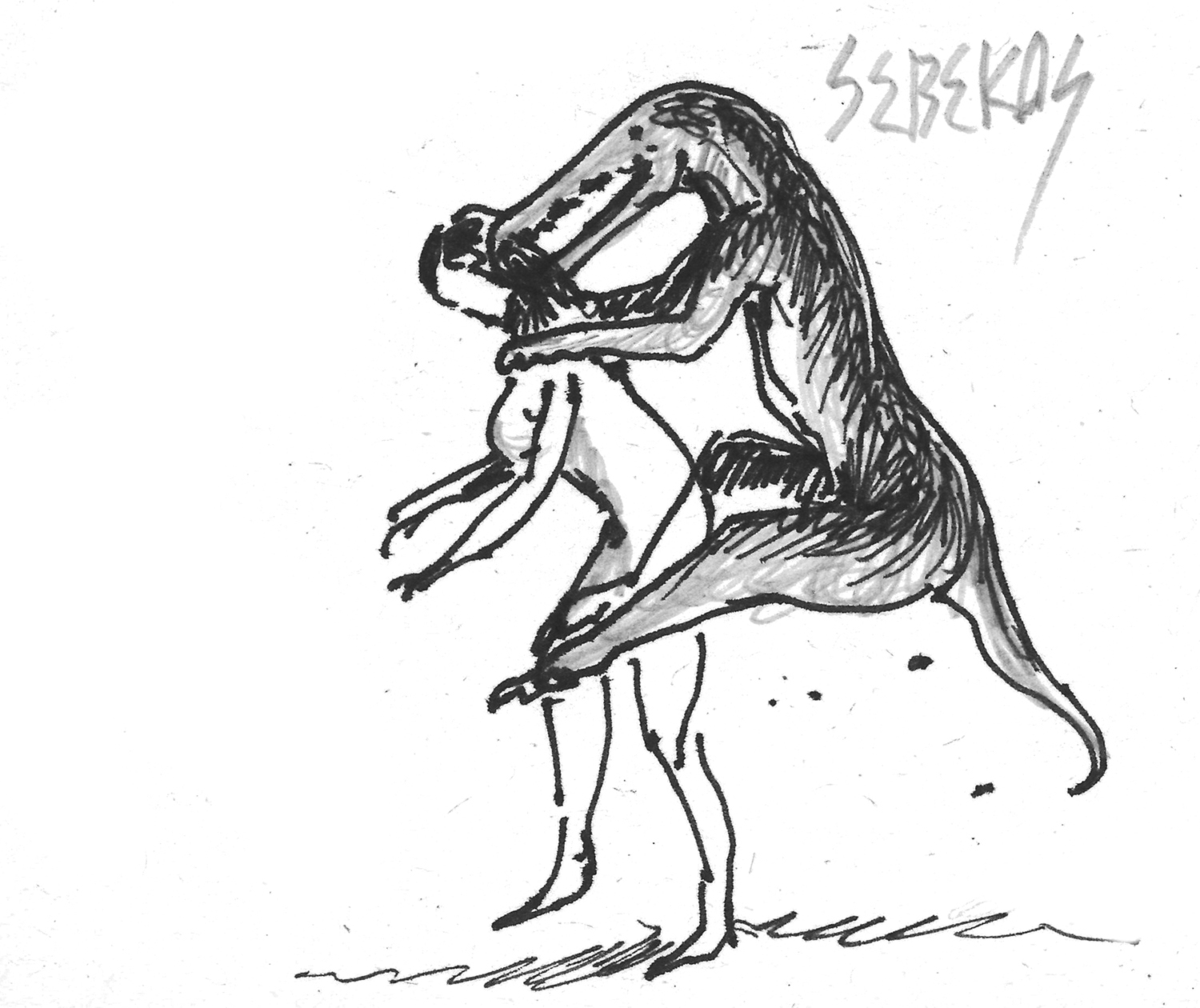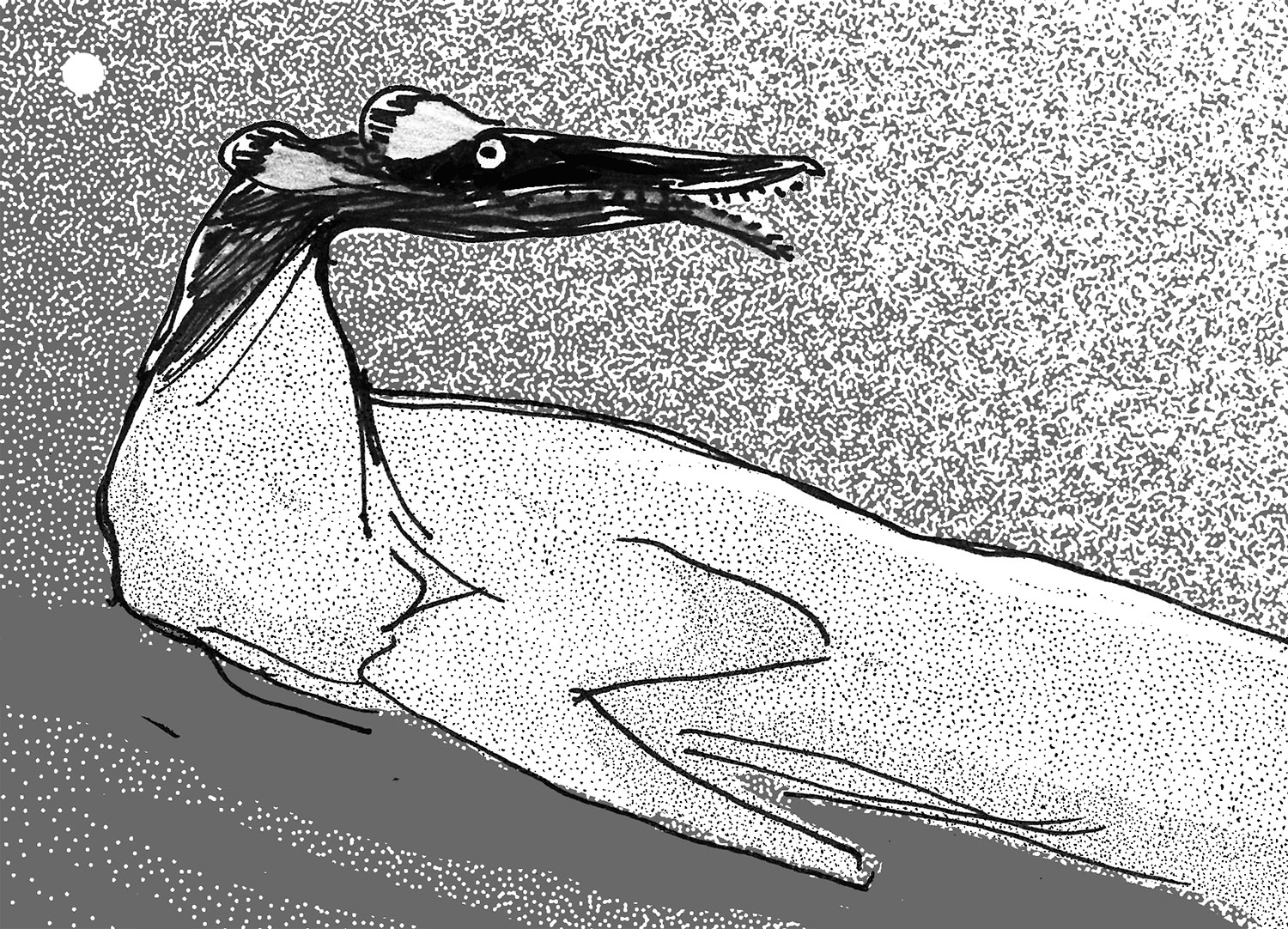 Sketch of a crocodile-like creature jumping on a naked human.