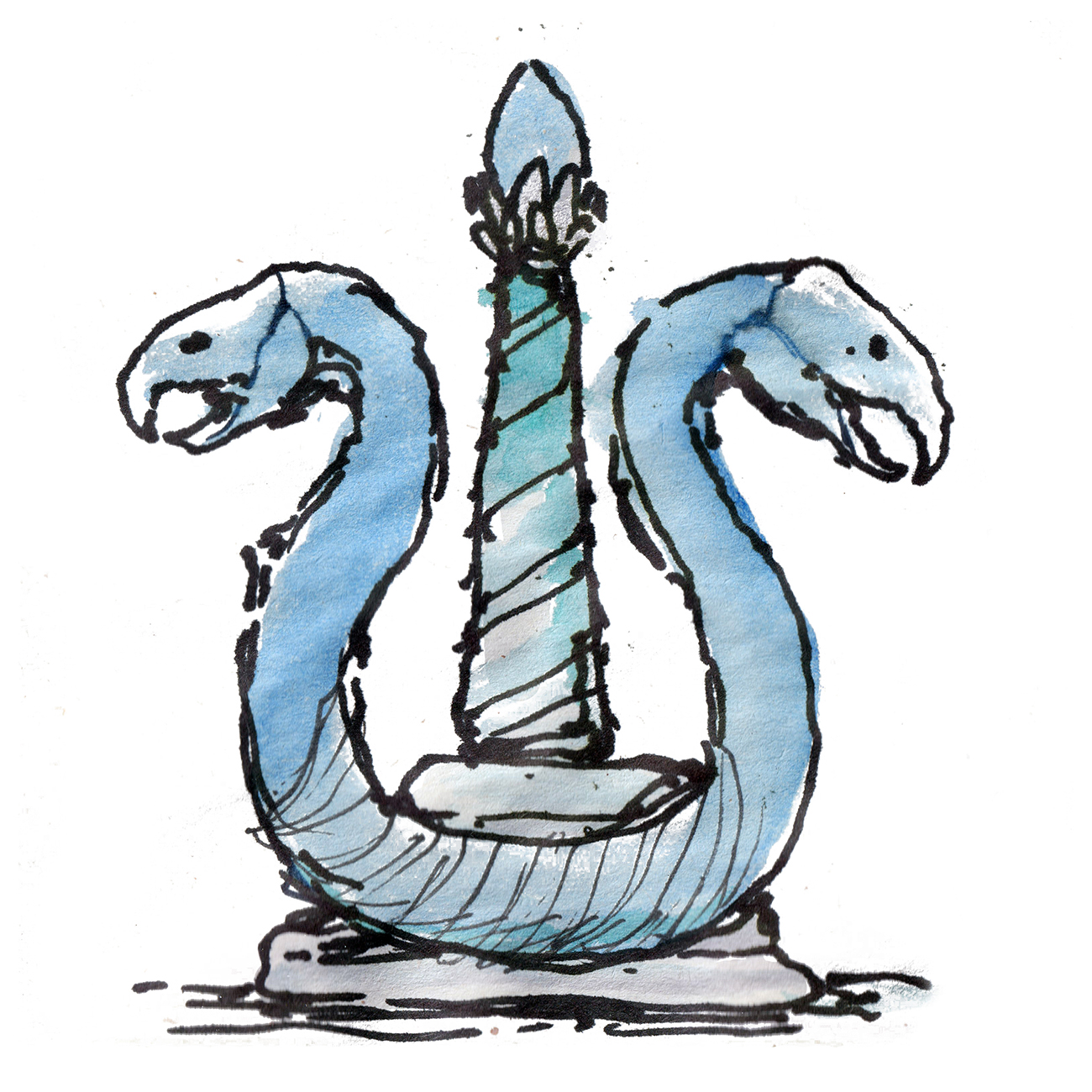 Watercolour-and-ink sketches of two long spirits.