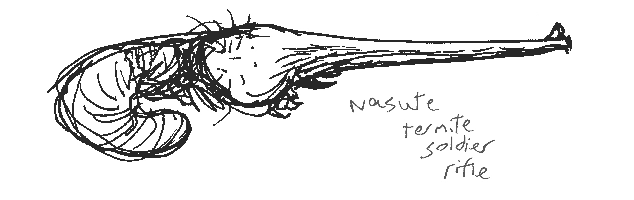 Sketches of insectile "organic rifles", culminating in a big fat termite that one simply cradles about and shoots like a living squirt-gun. I have no idea why a civilisation potent enough to mould insects into kinetic weapons would need to have rifles, but this was nevertheless a fun exercise.