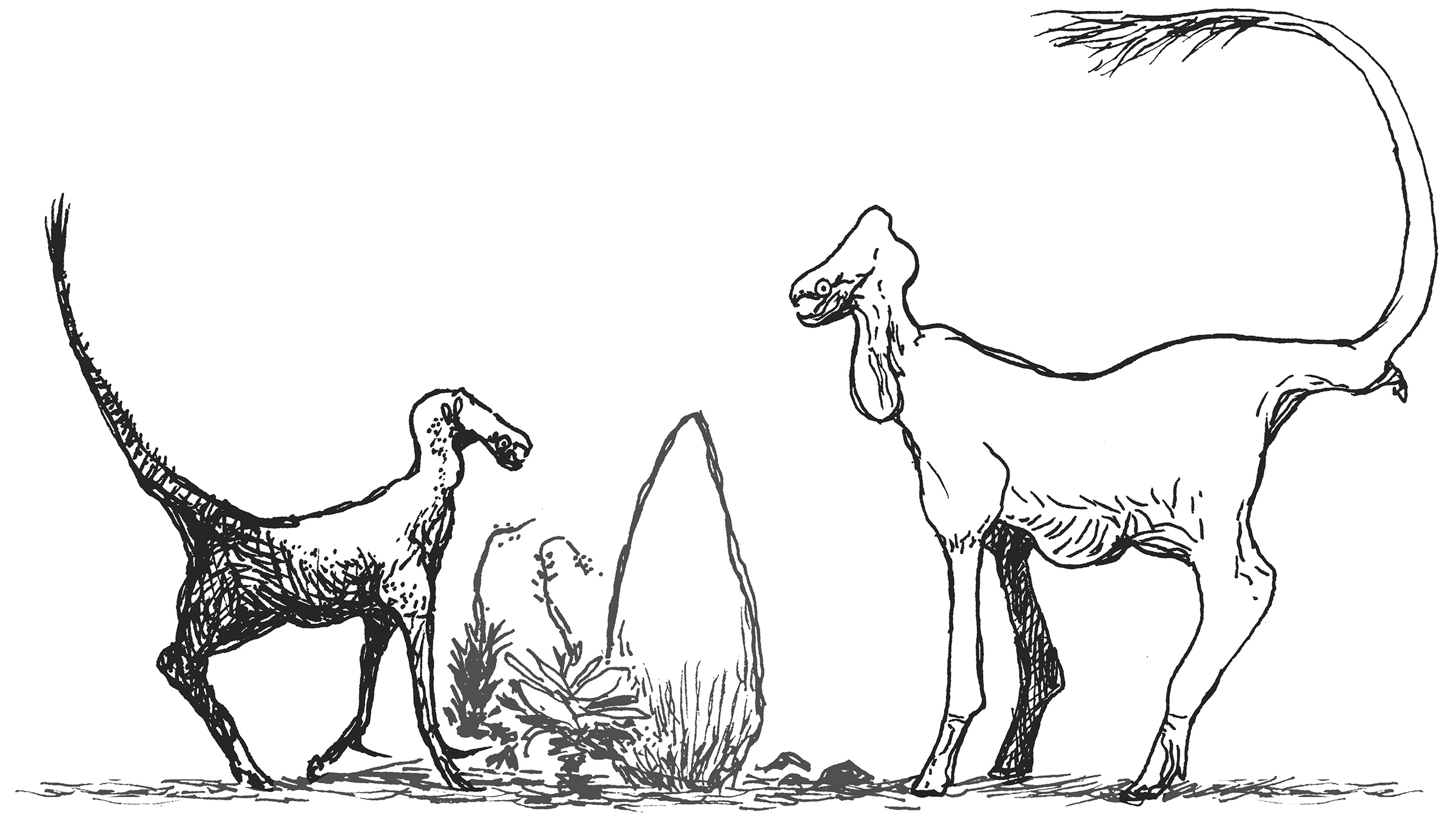 On the left is Gracilitribamus, a swift-footed hunter of small animals. On the right is Penumbrurus, a large omnivore with heavy legs and impressive wattles.